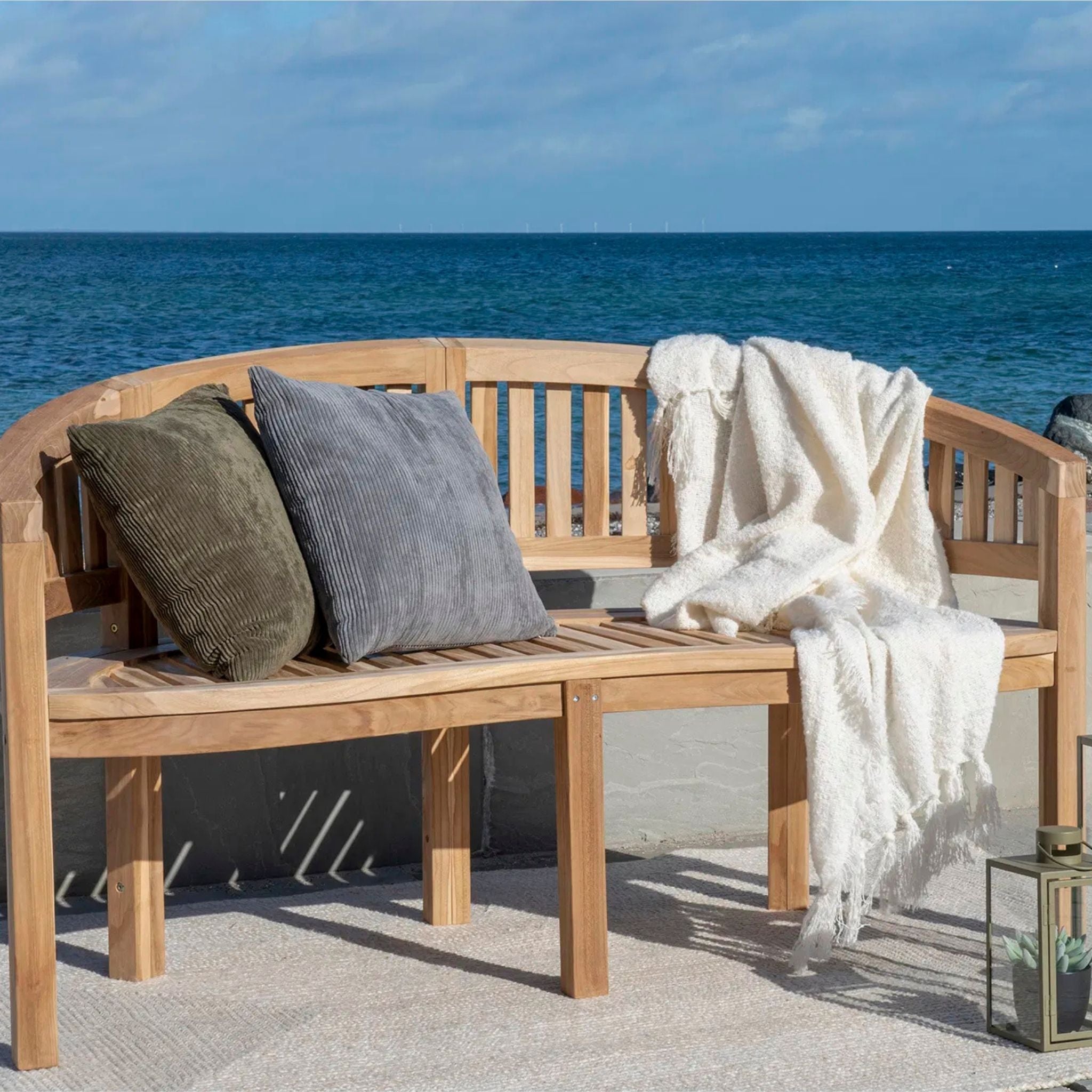 Tilføj varme og naturlig elegance med denne buede bænk i teaktræ, der passer både i haven eller på terrassen og giver et indbydende sted til afslapning hvor som helst.