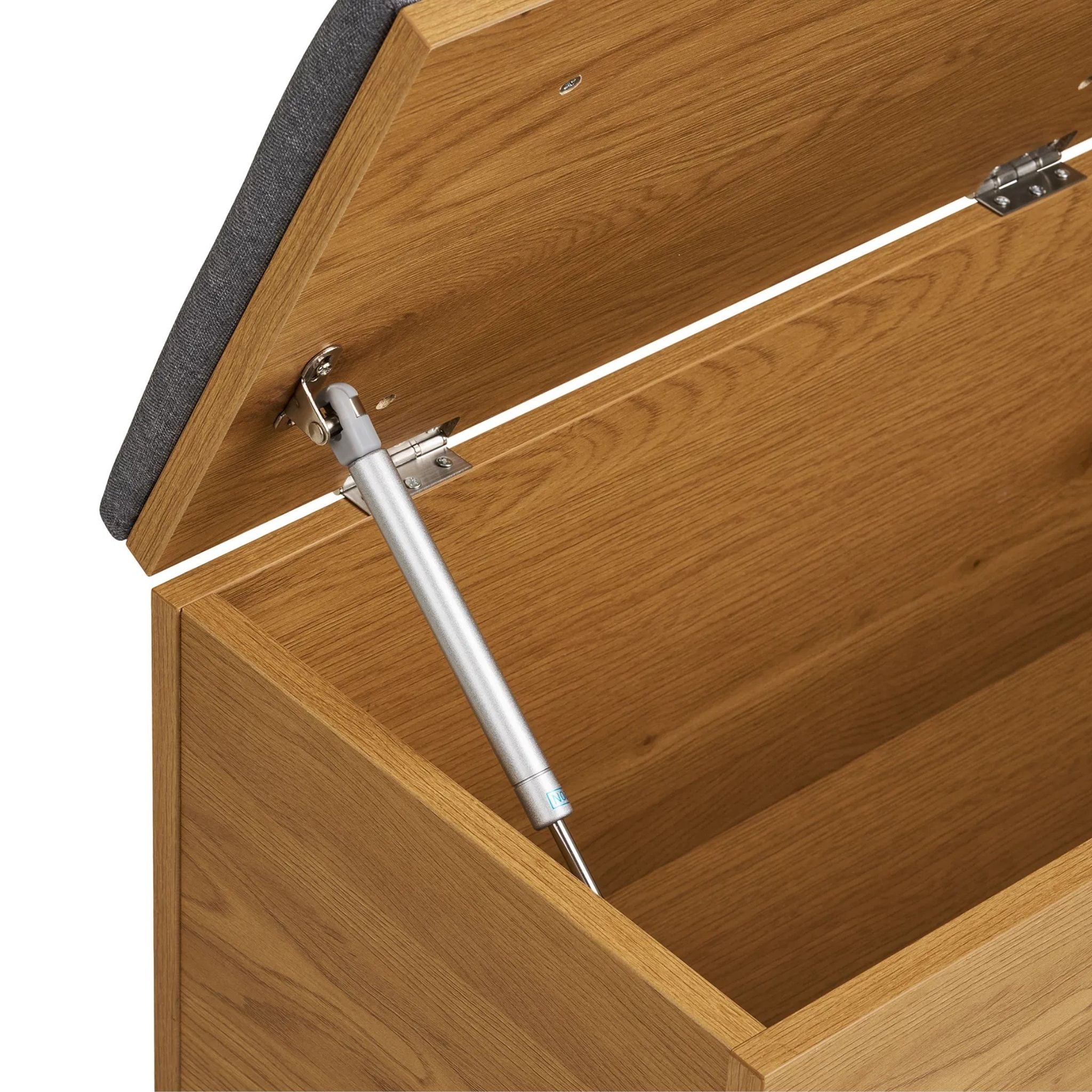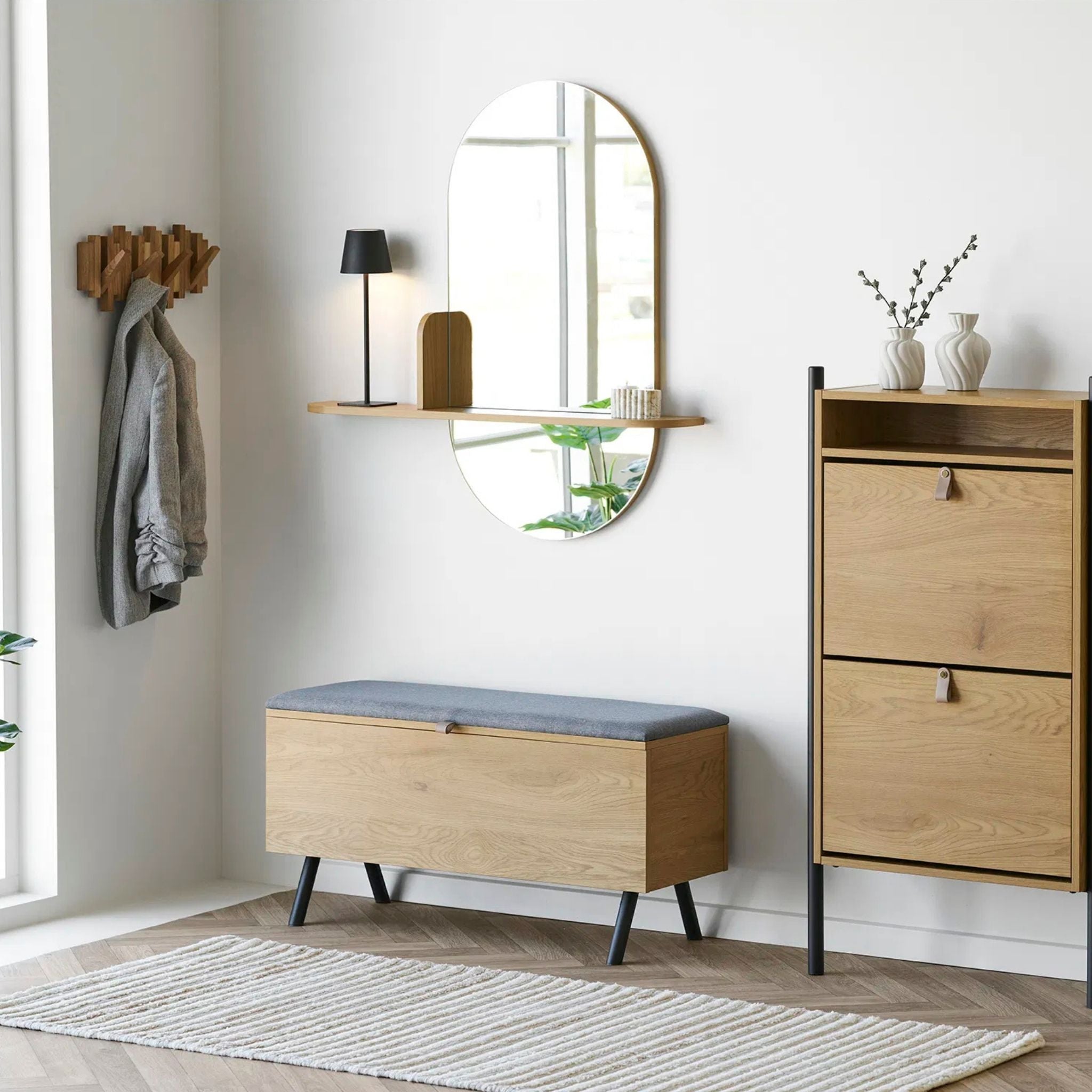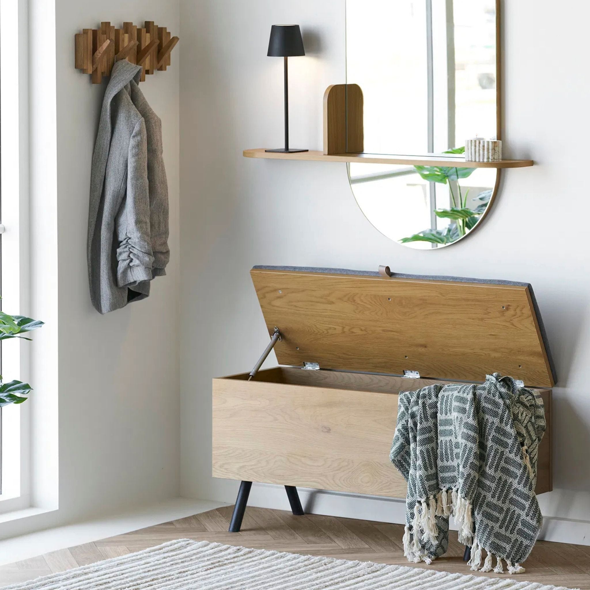 Her har du en stilfuld bænk i egetræslook med praktisk opbevaring, der kombinerer moderne design og funktionalitet. Den varme træfinish skaber en hyggelig stemning i entreen, soveværelset eller stuen, mens det rummelige opbevaringsrum gør det nemt at holde orden i hverdagens småting. En elegant og pladsbesparende løsning, der giver dit hjem et naturligt og indbydende udtryk.