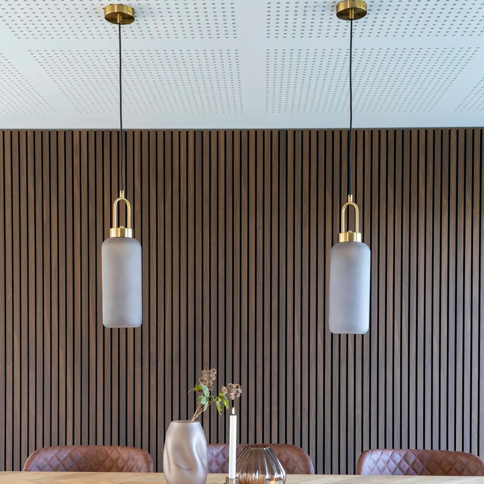 Den cylinderformede Luton pendel forener mat smokey glas og en messingfarvet fatning i et elegant design. Lampen spreder et varmt, behageligt lys og tilfører rummet et moderne og stilfuldt udtryk.
