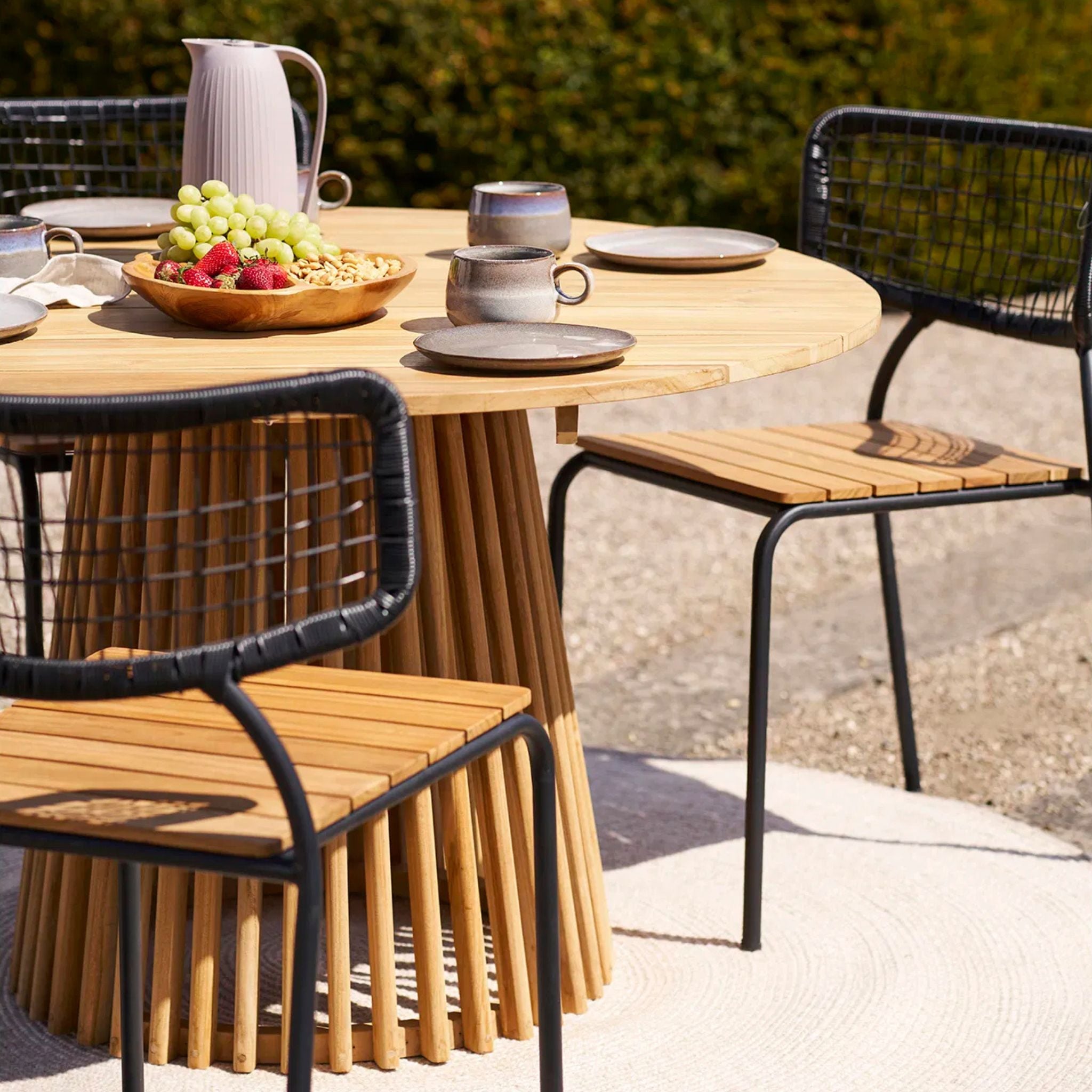 Det runde spisebord i teaktræ tilføjer varme og karakter til din spisestue med sit tidløse og elegante design. Bordets naturlige træstruktur skaber en indbydende atmosfære, der passer smukt ind i enhver indretning.