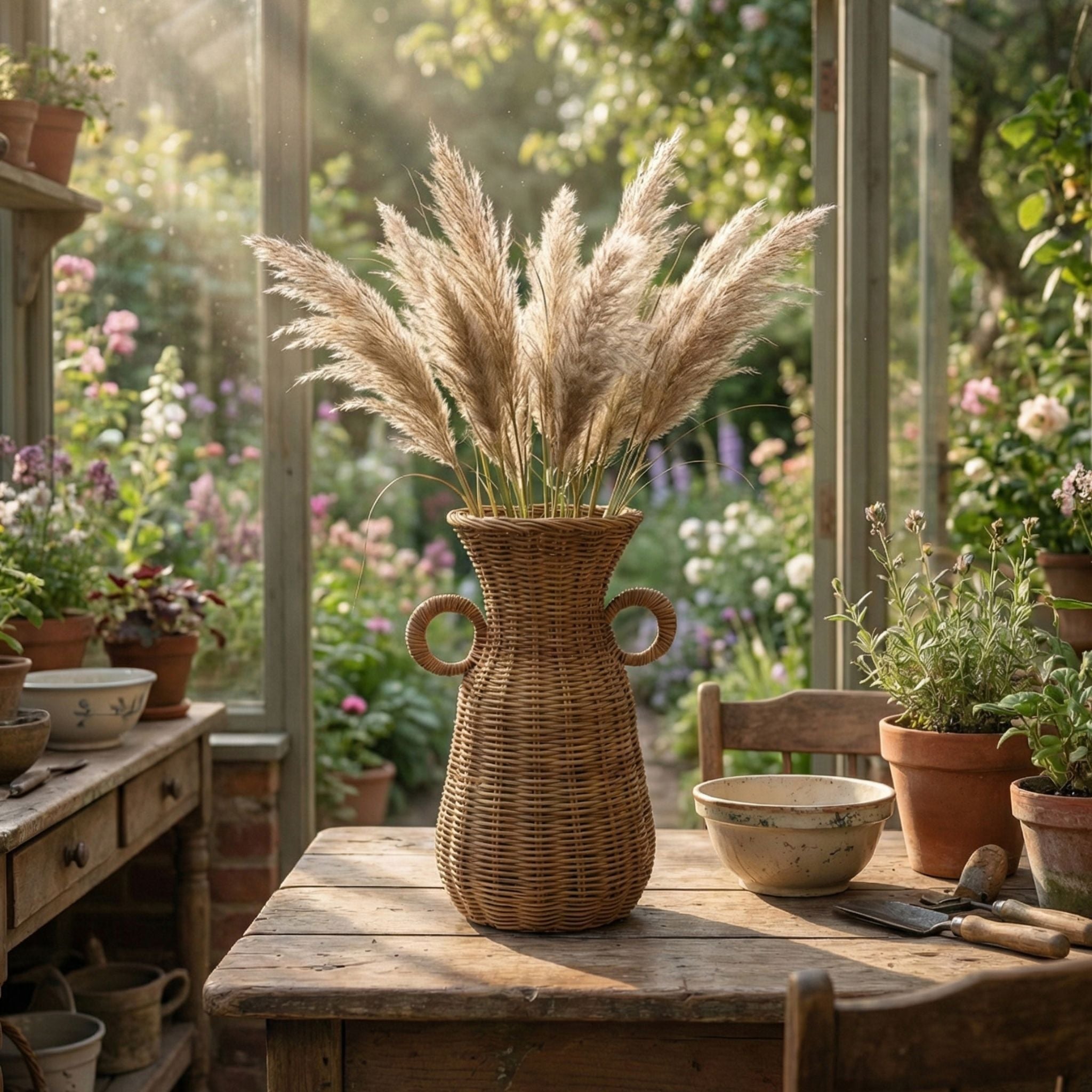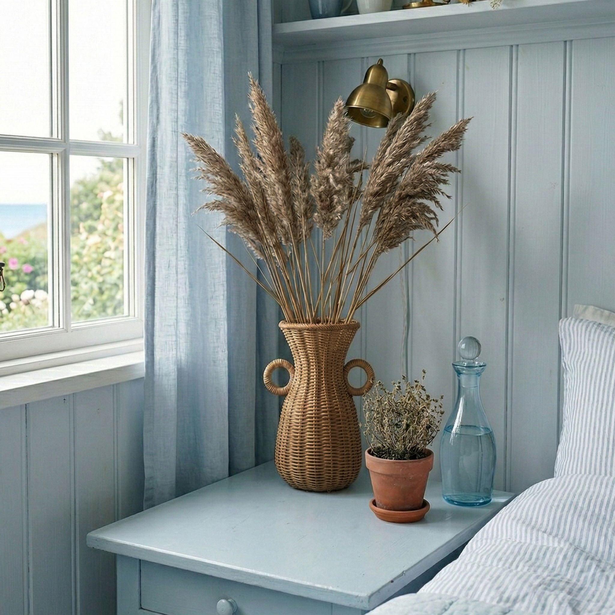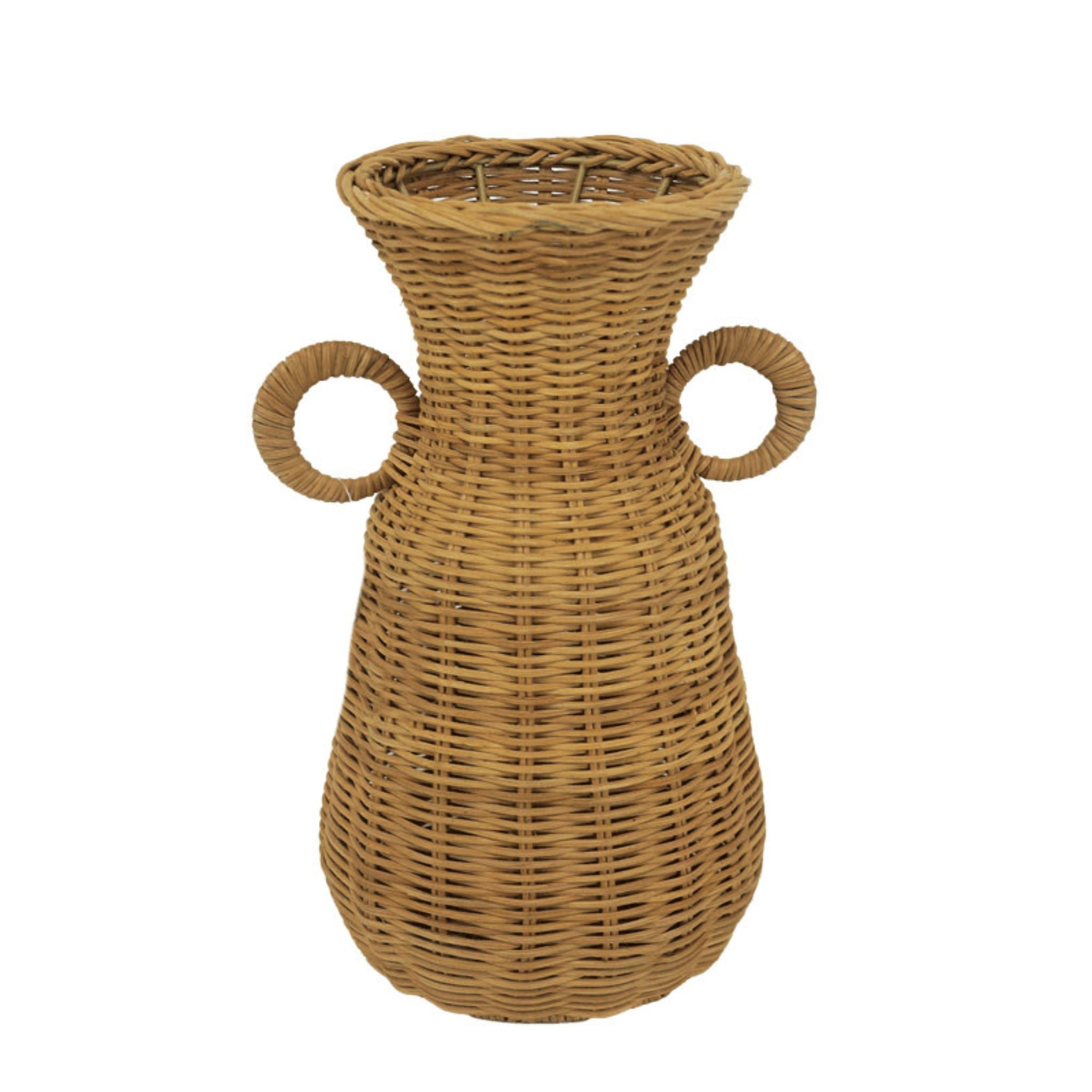 En dekorativ vase i naturfarvet rattan, der tilfører et varmt og naturligt udtryk til din indretning. Det smukke flettede design gør vasen til en stilfuld detalje i både stue, entré eller på spisebordet. Brug den til tørrede blomster for et roligt og nordisk look, eller sæt et glas med vand i vasen, så den også kan bruges til friske blomster.